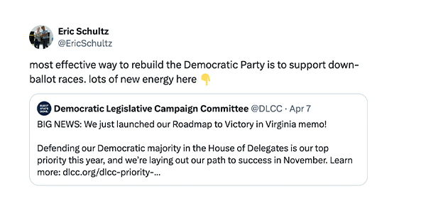 WASHINGTON— As state legislative Democrats continue to overperform by a double digit average, the DLCC launched its Roadmap to Victory in Virginia memo, including an ongoing seven-figure investment to maintain the Democratic majority in the House of Delegates.