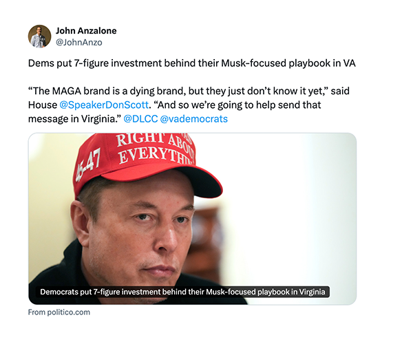 Politico: Democrats look to ride anti-Musk sentiment to victory in Virginia next