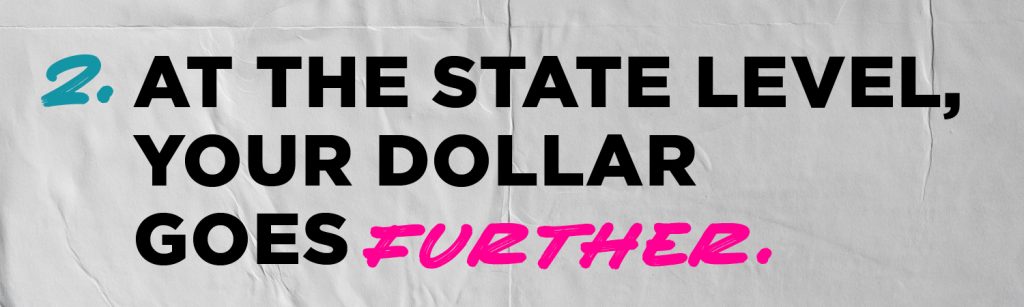 At the state level, your dollar goes further. There are thousands of state legislative seats all across the country, many with only a few thousand voters. That means the party that controls state government often comes down to just a handful of votes.