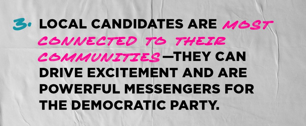 Local candidates are most connected to their communities – they can drive excitement and are powerful messengers for the Democratic Party. Our candidates are products of their communities whose values and lives are interwoven in their neighborhoods. They’re veterans, working parents, immigrants, and business owners, and they’re already out in their communities knocking on doors and talking with voters.