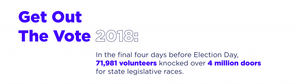 The DLCC worked closely with staff and partners on the ground to determine goals and develop strong field programs — with huge results. Our field team shattered previous records by working with 27 caucuses to knock on over 17 million doors in 2018, all while flipping dozens of special election seats and holding the line in countless others. And that doesn’t count the millions more doors knocked during the 2017 races in Virginia and New Jersey.