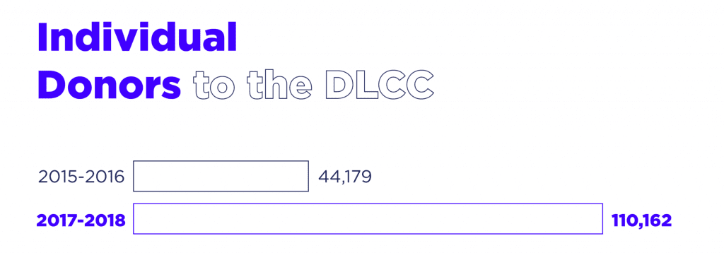 Last cycle, the DLCC made a commitment to raise $30 million, more than in any previous cycle. We blew that number out of the water, ultimately raising more than $35 million from over 110,000 donors — more than doubling our number of individual donors and overall budget from the 2015–2016 electoral cycle.