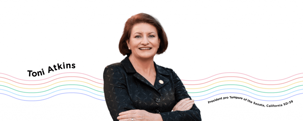 The day Toni Atkins was elected as president of the Senate in 2018, the California Capitol was draped with a Pride flag. From that historic moment onward, Toni has been proudly representing the LGBTQ+ community and her constituents.