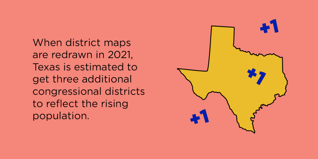 Once the population statistics are finally delivered, the maps will then be redrawn to ensure that each district has an equal number of people. Texas is a great example: The state grew by four million people in the last ten years — so when district maps are redrawn in 2021, Texas is estimated to get three additional congressional districts to reflect the rising population.