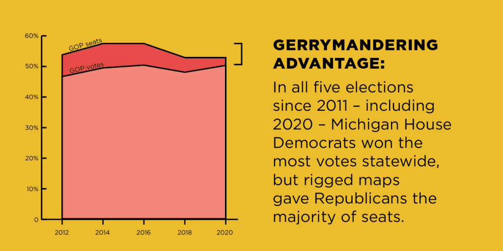 In Michigan, Republicans drew districts that were ridiculously skewed in their favor. In all five elections since 2011 — including 2020 — Michigan House Democrats won the most votes statewide, but rigged maps gave Republicans the majority of seats. We also saw the devastating consequences of Republican gerrymandering in Wisconsin, where Republicans rigged the maps to make it practically impossible for Democrats to win. In the 2018 elections, Assembly Democrats won 53% of the vote but only won 36% of the seats.